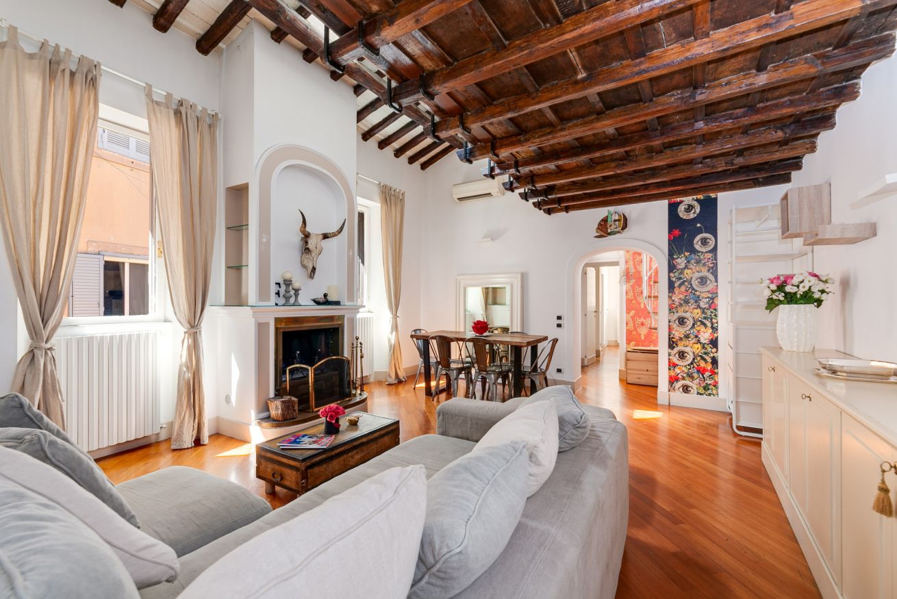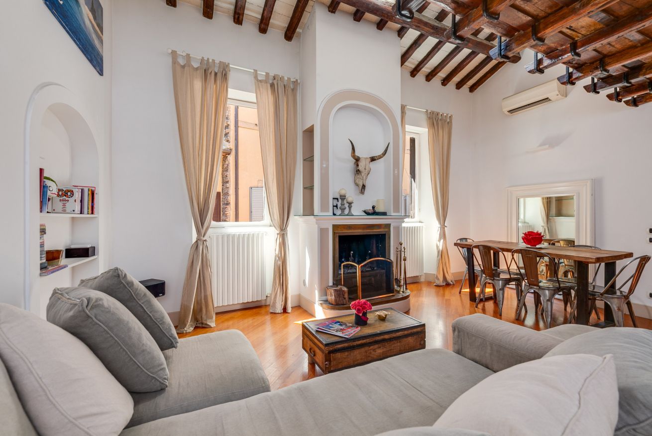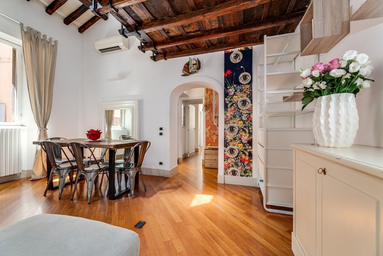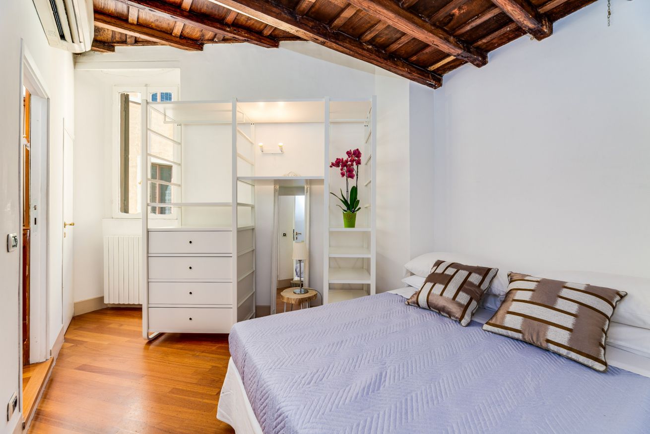 Splendido appartamento a due passi da Piazza Navona e Campo de' Fiori, in una tranquilla via del cuore della vecchia Roma. Distribuito su due livelli, offre una camera matrimoniale con bagno en suite, un ampio salone con camino e una cucina ben attrezzata al piano inferiore. Al secondo livello, due camere da letto e un bagno con doccia. Dotato di Wi-Fi e aria condizionata, rappresenta un rifugio prestigioso al centro di Roma.